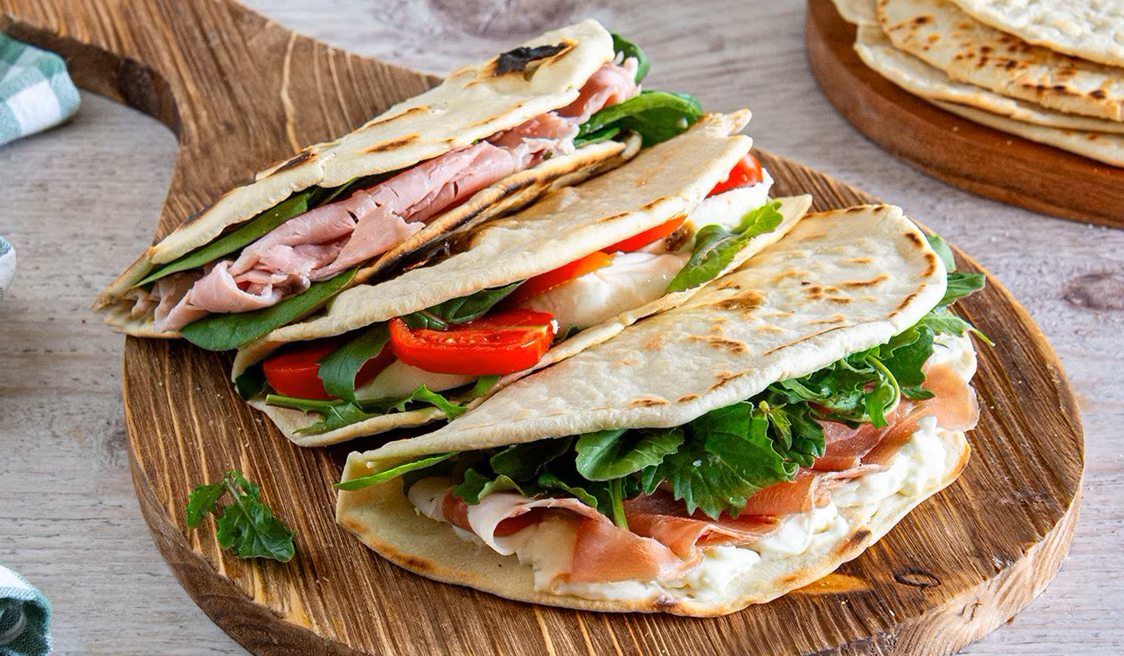 Piadina con prosciutto cotto, mozzarella e pomodoro