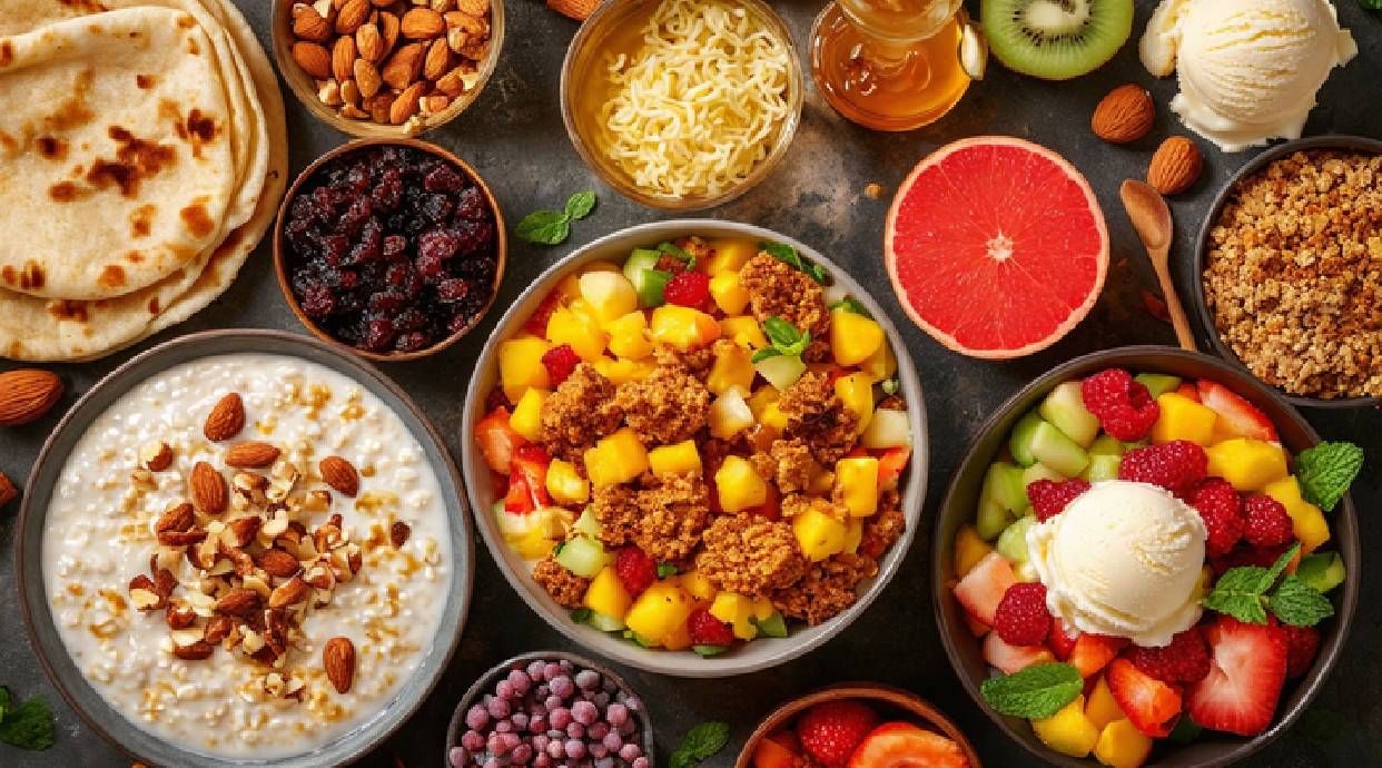 A refreshing fruit salad topped with creamy yogurt, sweet honey, and crunchy nuts.