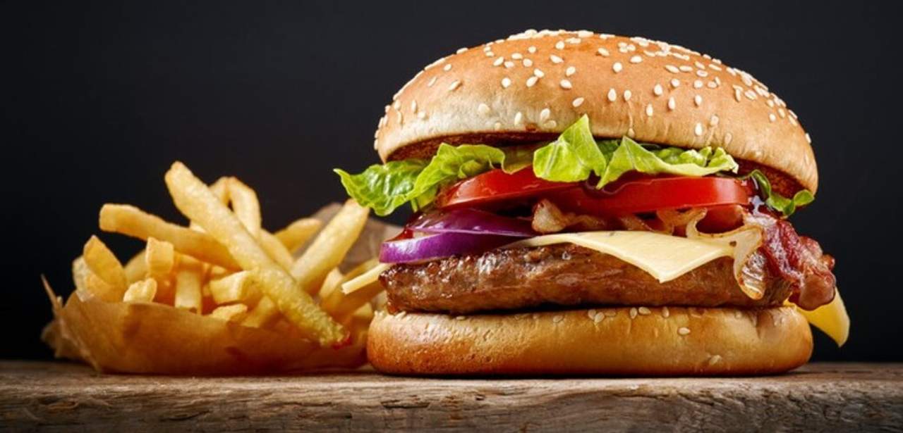 Pain maison, steak viande hachée, bacon de dinde, pommes de terre, fromage, frites