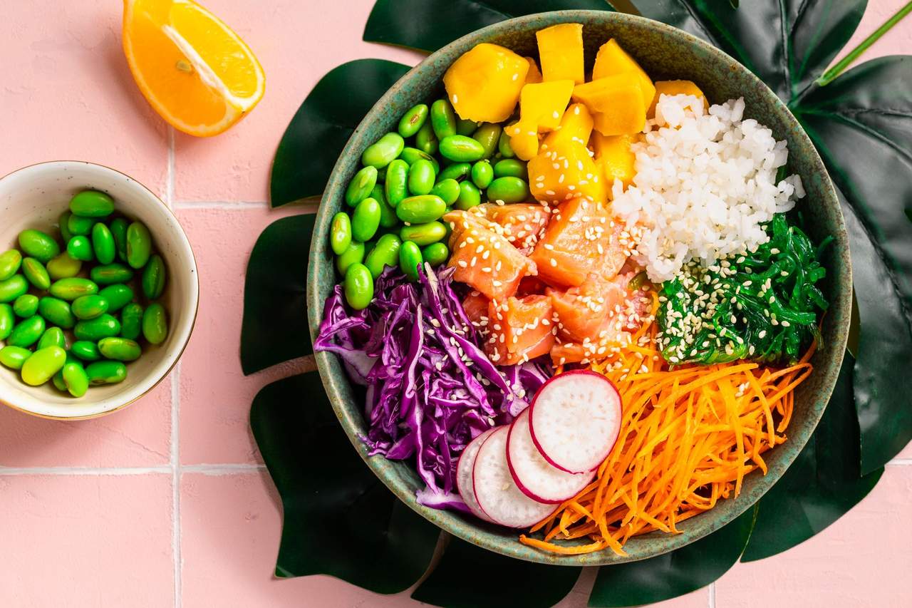 Baza: Orez. Proteine: Creveți. Vitamine: edamame, roșii chery, avocado, ananas.