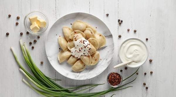 Pielmienie wieprzowe podane z masłem, gęstą śmietaną i octem (8 szt.)