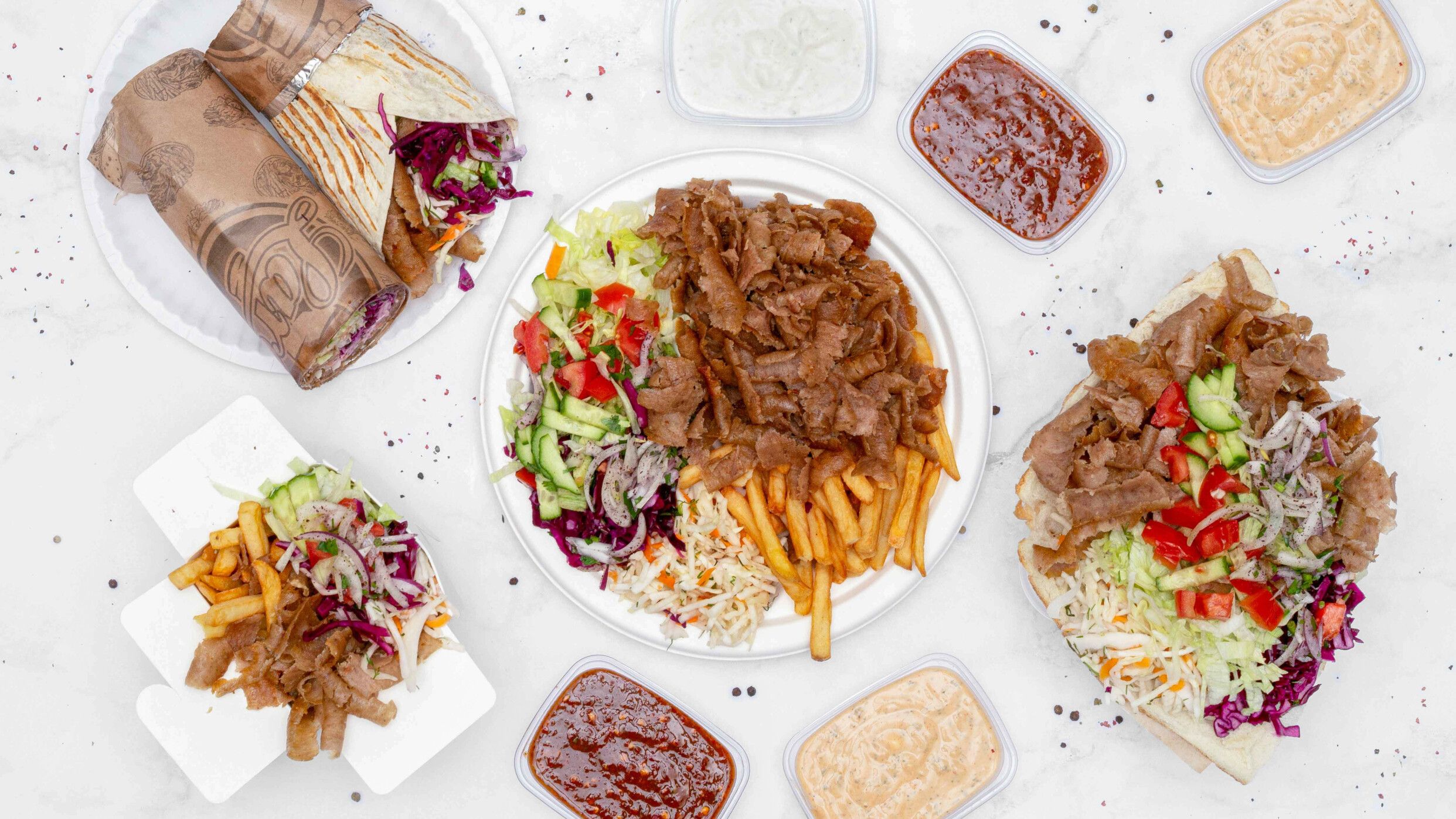170g wybranego mięsa, wybrane sosy, frytki, surówki (cebula z sumakiem i pietruszką, czerwona kapusta, biała kapusta, lodowa, ogórek i pomidor)