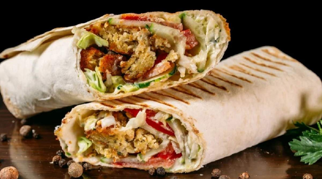 autorski lawasz, cztery kotleciki z ciecierzycy, sosy, sałata lodowa, pomidor, ogórek, cebula