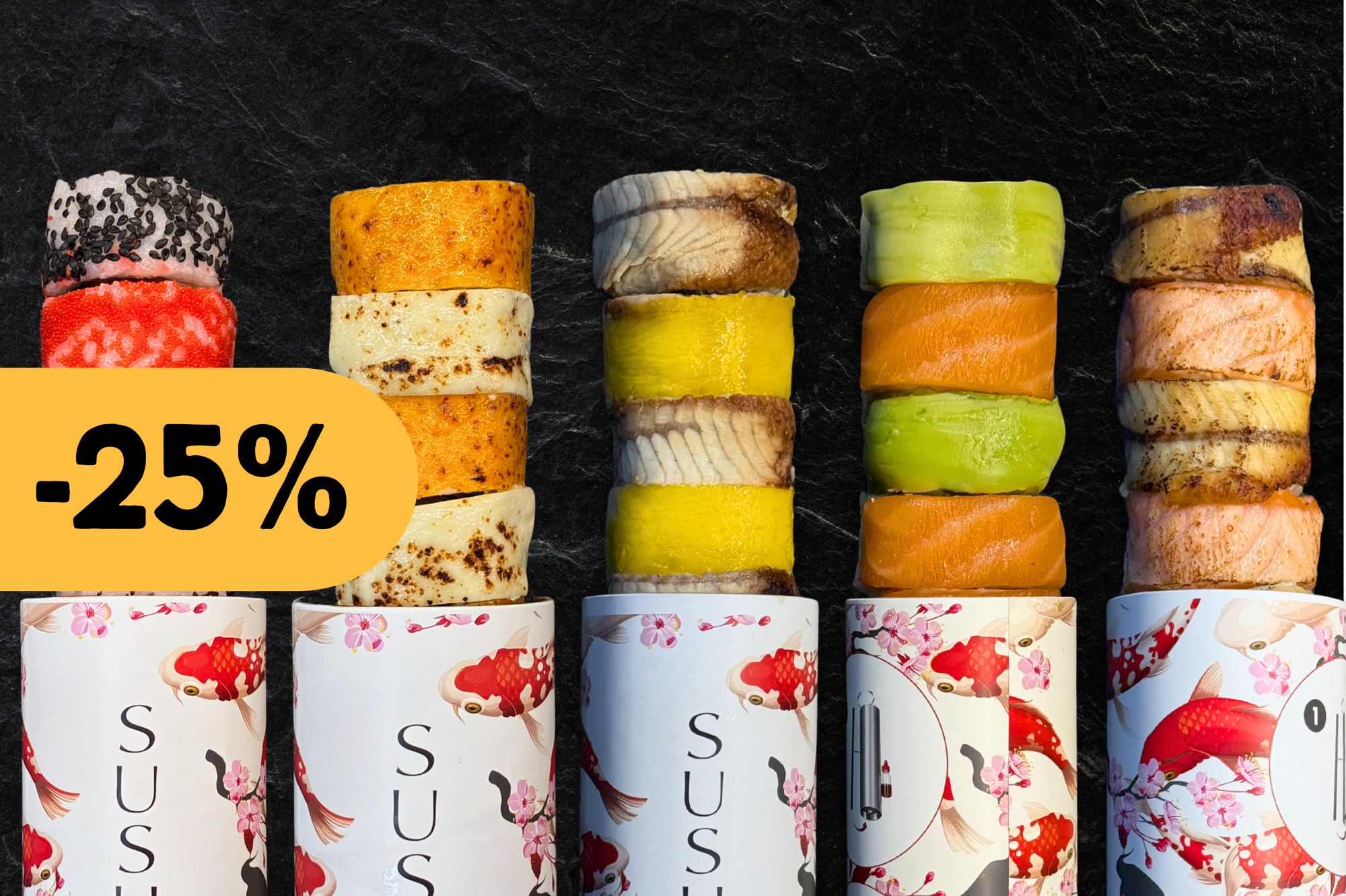 6x futomaki z krewetkami, 6x futomaki z łososiem w tempurze, 6x futomaki z kurczakiem w panko, 6x futomaki z węgorzem, 6x futomaki z łososiem i serkiem, 8x hosomaki z łososiem teriyaki. Smaki: mango, awokado, BBQ, cheddar, unagi, kobe.