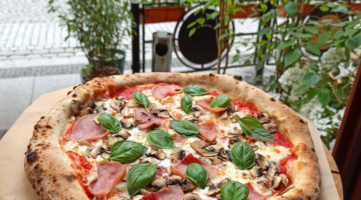 Pizza na tradycyjnym cieście (38 cm) z sosem pomidorowym, ziołami i prawdziwym serem mozzarella, szynką i pieczarkami