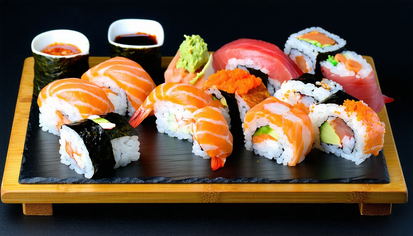 Łosoś, ser, awokado, ogórek, tatar z łososia (łosoś, majonez, masago, szczypiorek)