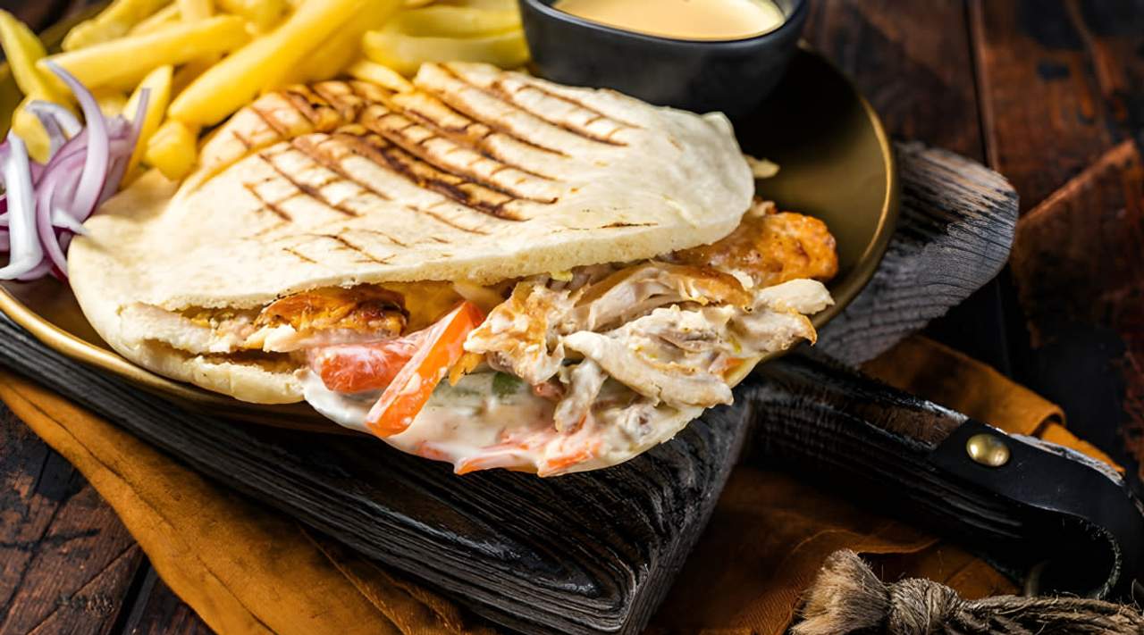 Z mięsem do wyboru, sałatą lodową, ogórkami, pomidorami, papryką, serem i sosem