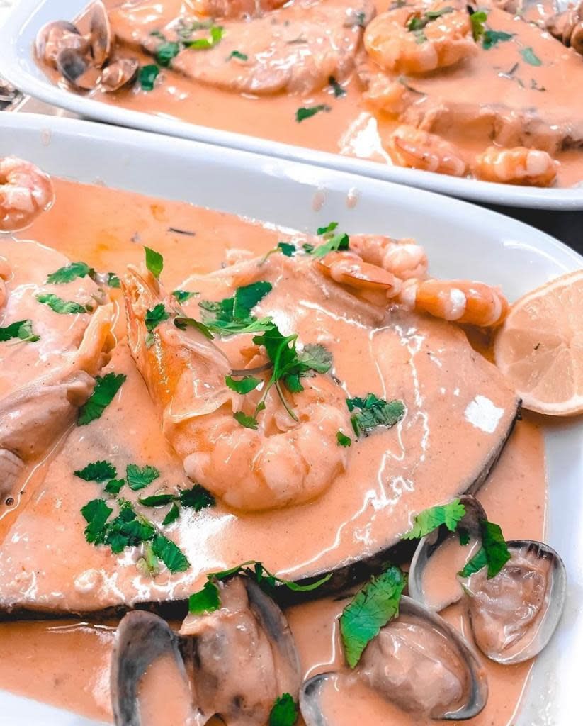 Molho com ameijoa e camarão, acompanhado com batata frita
