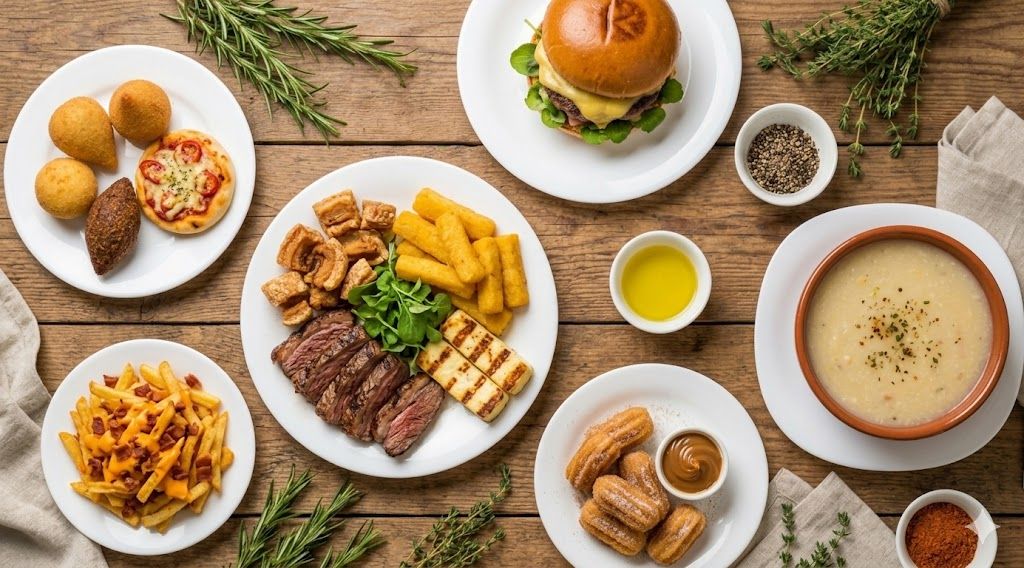 Mandioquinha frita, tenra picanha, queijo coalho grelhado e saboroso frango a passarinho em uma tábua completa.