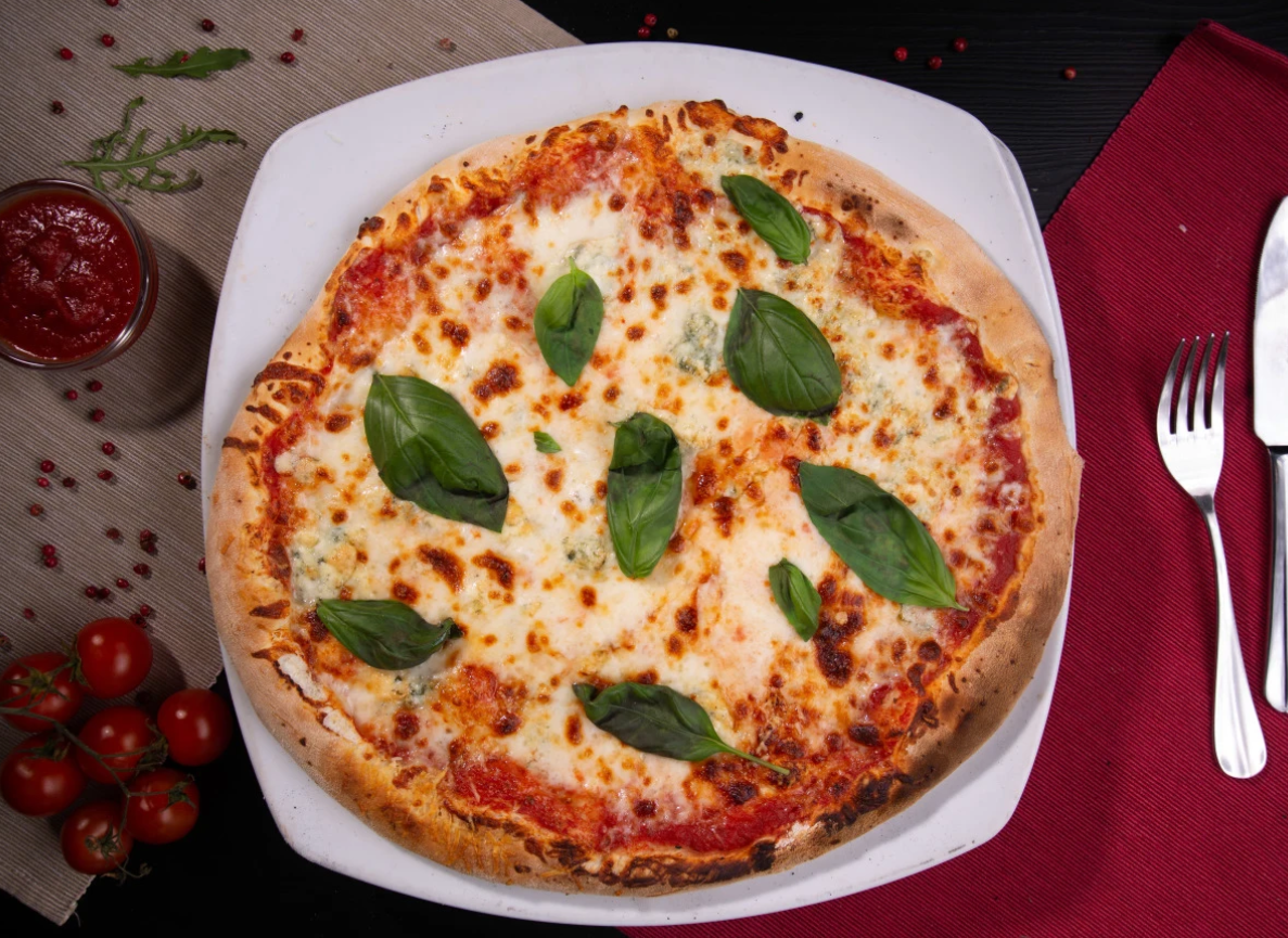 sos de pizza, mozarellam sunca presata, porumb, ciuperci, ardei