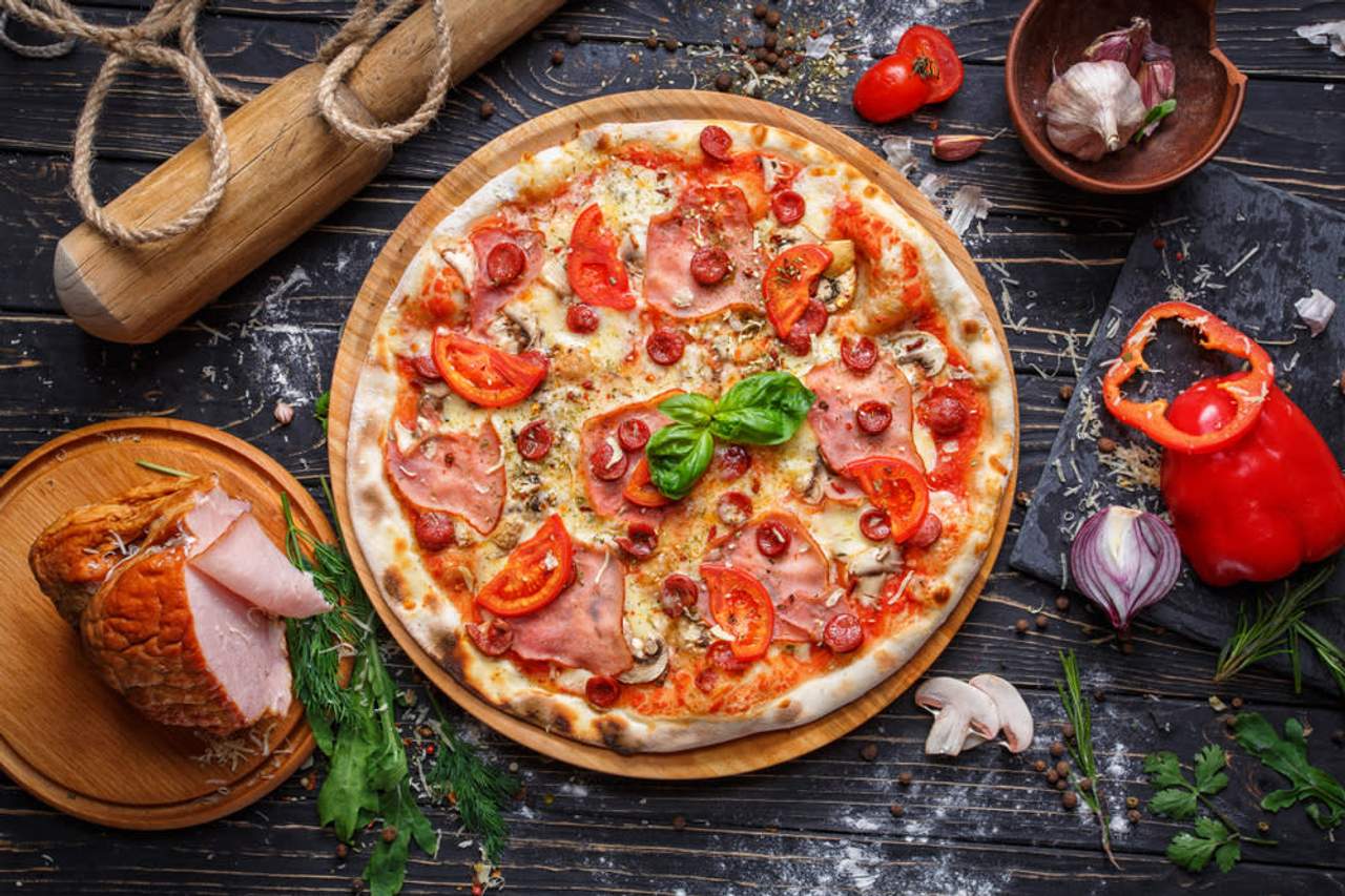 Sos de rosii, mozzarella, sunca, salam, bacon, carnati