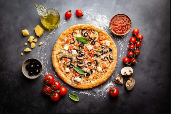 Sos rosii, mozzarella, bacon afumat, sunca, ciuperci, ardei gras, masline - 1kg