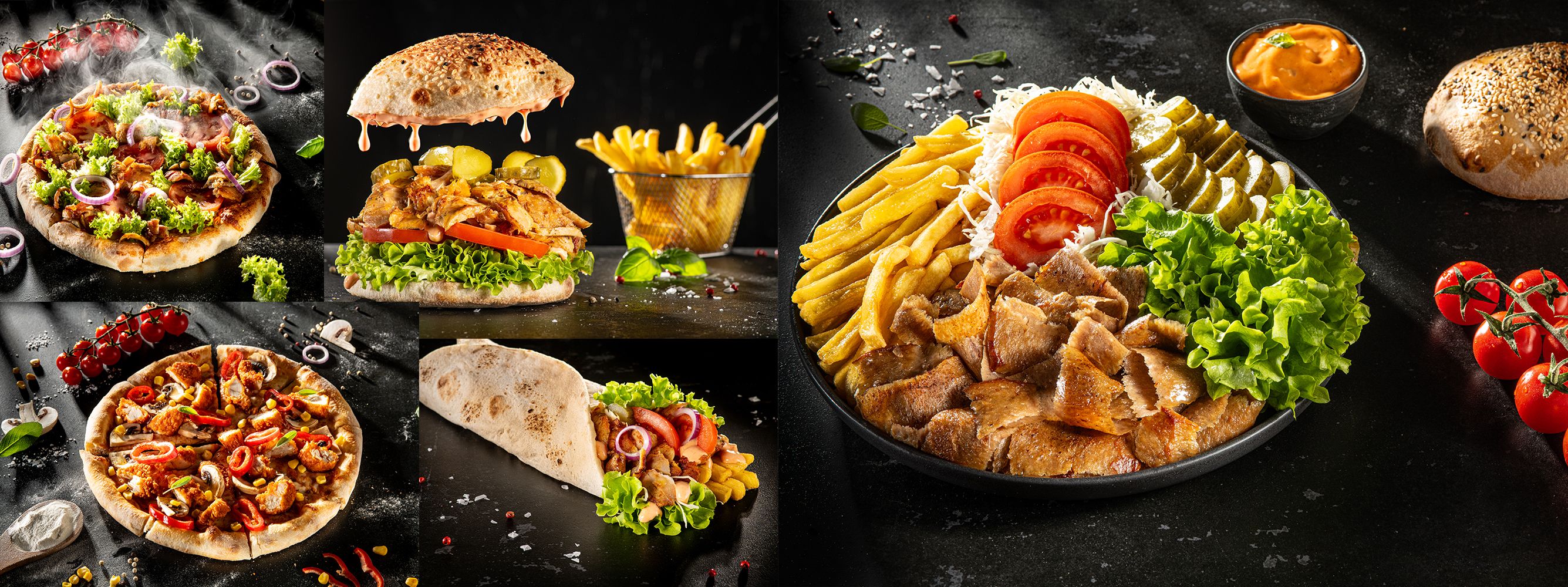 Carne de vită rotisată ,sos la alegere, salata, ceapa rosie , castraveti , rosii , plus 1 portie de cartofi prajiti si un suc la alegere 550 g