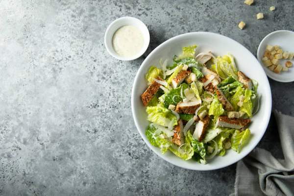 Piletina, zelena salata, slanina, parmesan, beli sos