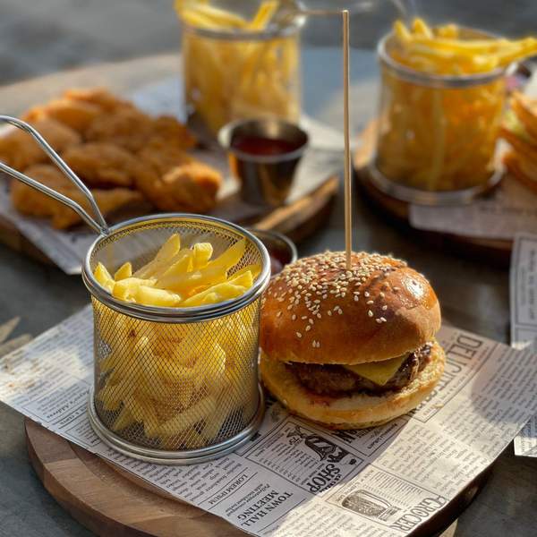Zemička, burger sos, iceberg salata, juneće meso, cheddar, krastavčić, paradajz, jaje, hrskava slanina