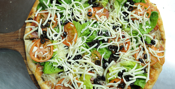 Tomato sos, kačkavalj, šampinjoni, suvi vrat, paradajz, zelena salata, crne masline