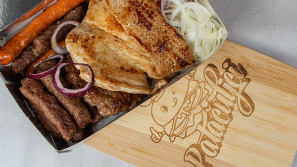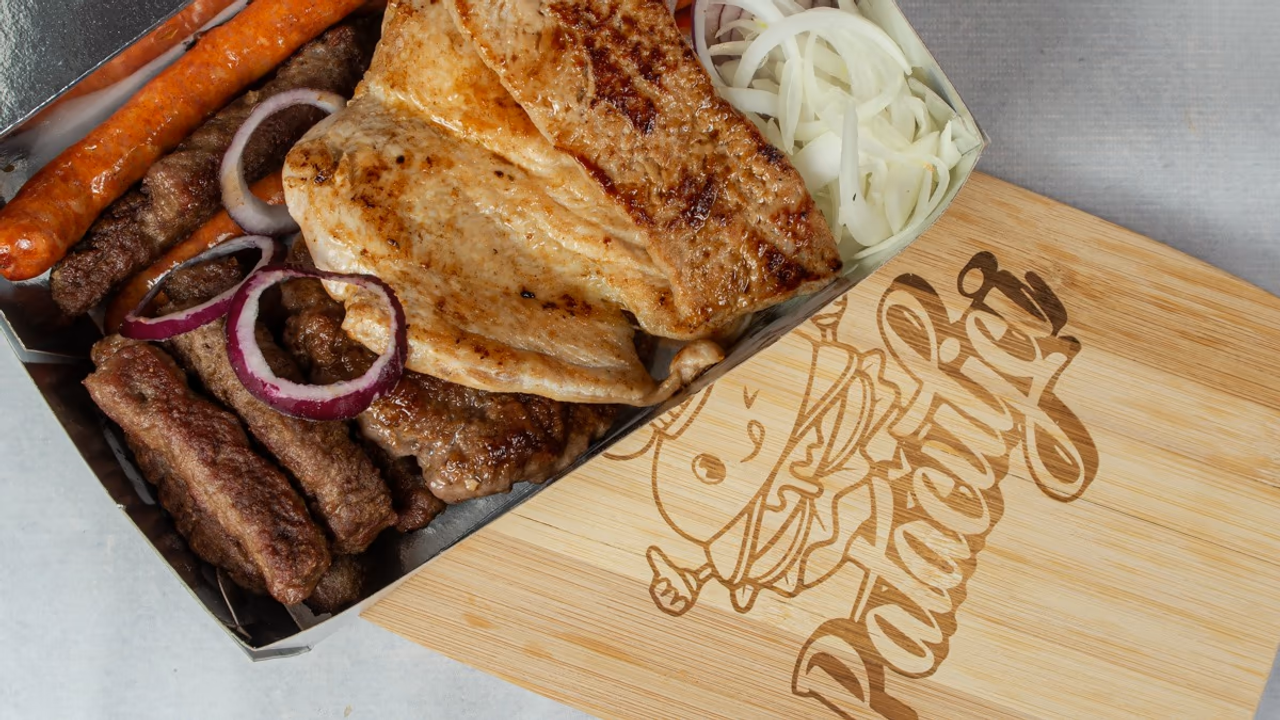 1.5 kg mešanog mesa, 300 g piletine, 200 g pljeskavice, 15 ćevapa, 200 g vešalica, 200 g kobasice, 150 g slanine i gratis 2 lepinje i pomfrit