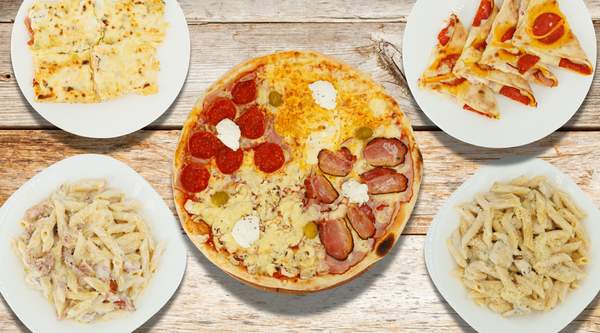 Pelat, šunka, kačkavalj, preliv ( jaje, pavlaka, feta) pečenica, pančeta, dimljena vešalica, masline