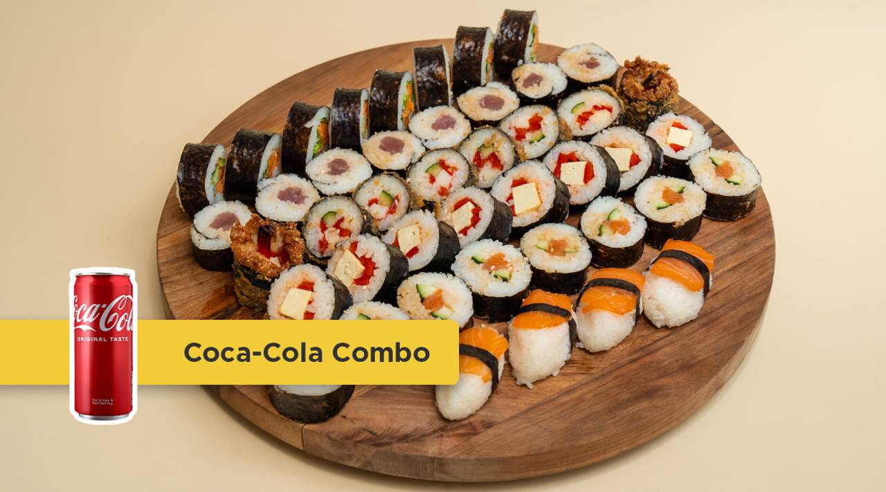 250 grama. Nori alga, pirinač, surimi, krastavac, mango, avokado, kozice (ebi), losos, mango dresing, eel dresing