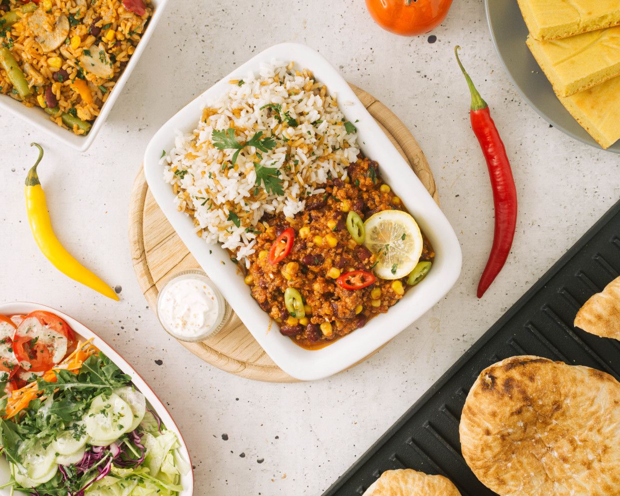 Chili con carne, pirinač, iceberg, jedan namaz po izboru