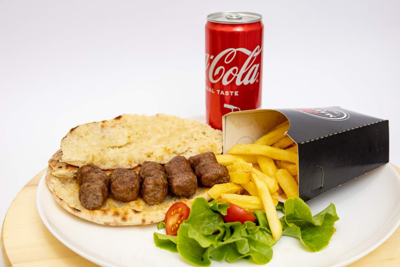 5 ćevapa u somunu sa prilozima po želji, pomfrit i Coca Cola 0.33l