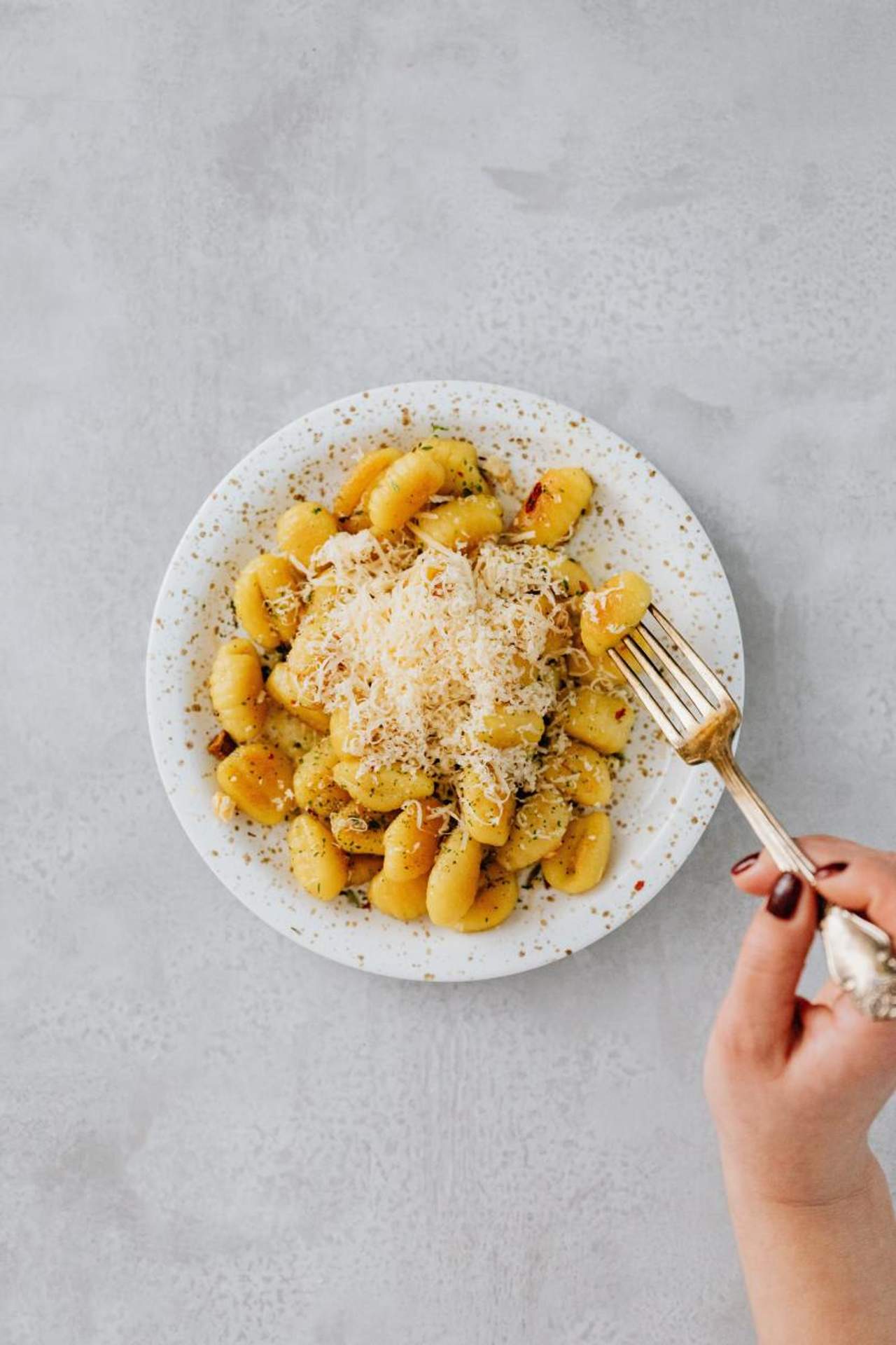 Pasta njoke, pileći file, spanač, šampinjoni, neutralna pavlaka i paradajz čeri