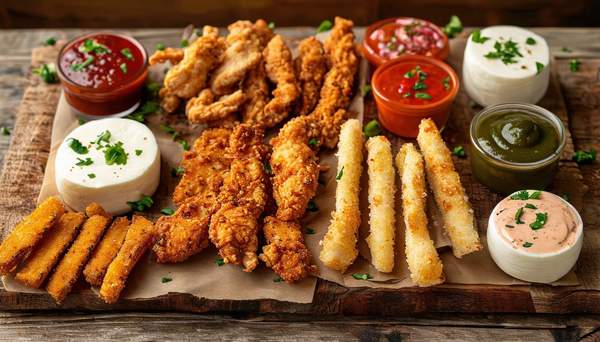 5 mini karađorđeve šnicle, 6 šnicli, pohovani štapići, pohovani sir, sosevi, kupus salata, domaće lepinje