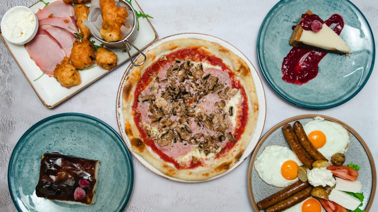 Pelat, mocarela, šunka, šampinjoni, jaje, origano, masline