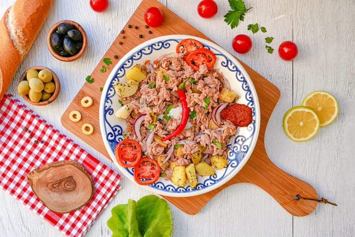 Tomate, oignon, œuf, thon, pomme de terre