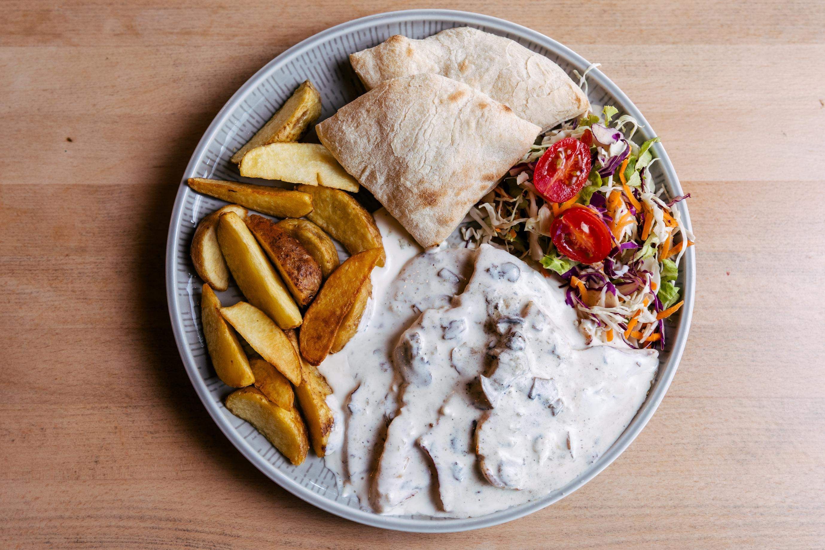 Pileći file sa gorgonzolom, salatom i krompirićima