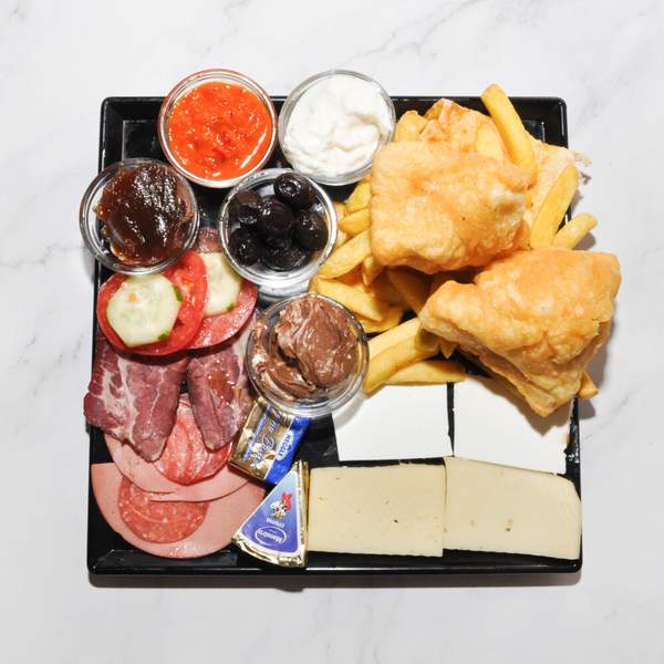 Raznovrstan i obilan obrok koji uključuje širok spektar jela i sastojaka poput 2 šolje čaja, različitih sireva, maslina, džema, salate, salame, kobasica, pomfrita, maslaca, meda, čokolade, omleta, ajvara, kajmaka i suhog mesa