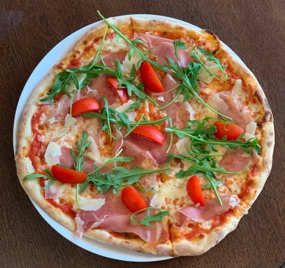 Доматен сос, моцарела, прошуто Крудо, рукола, пармезан, чери домати