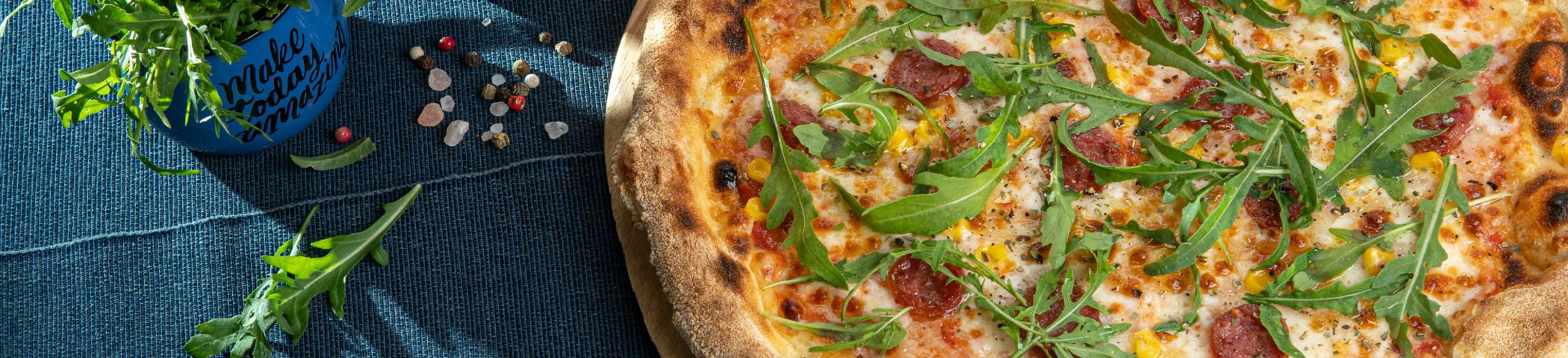 Доматен сос, моцарела, пушена скаморца, чери домати, рукола, риган