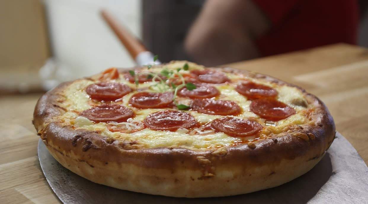 Доматен сос, пикантен салам пеперони, кашкавал, пресни гъби, пипер, маслини, топено сирене