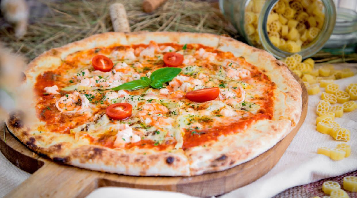 Tomate, mozzarella, atún, gambas, salmón y cebolla