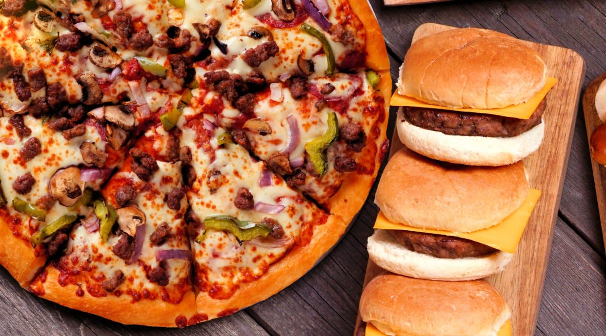 Tomate, queso, orégano, carne picada, cebolla, carne de pollo, curry, champiñones y tomate natural