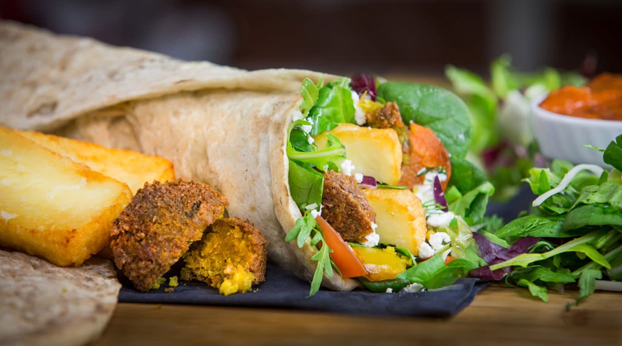 Carne (Ternera, pollo o mixto) enrollado en pan de pita, queso de oveja, ensalada y salsas