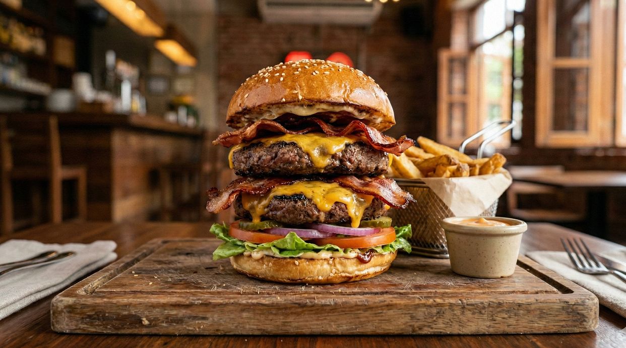 Hamburguesa de ternera con lechuga, tomate, cebolla, bacon, queso y huevo frito. Incluye patatas.
