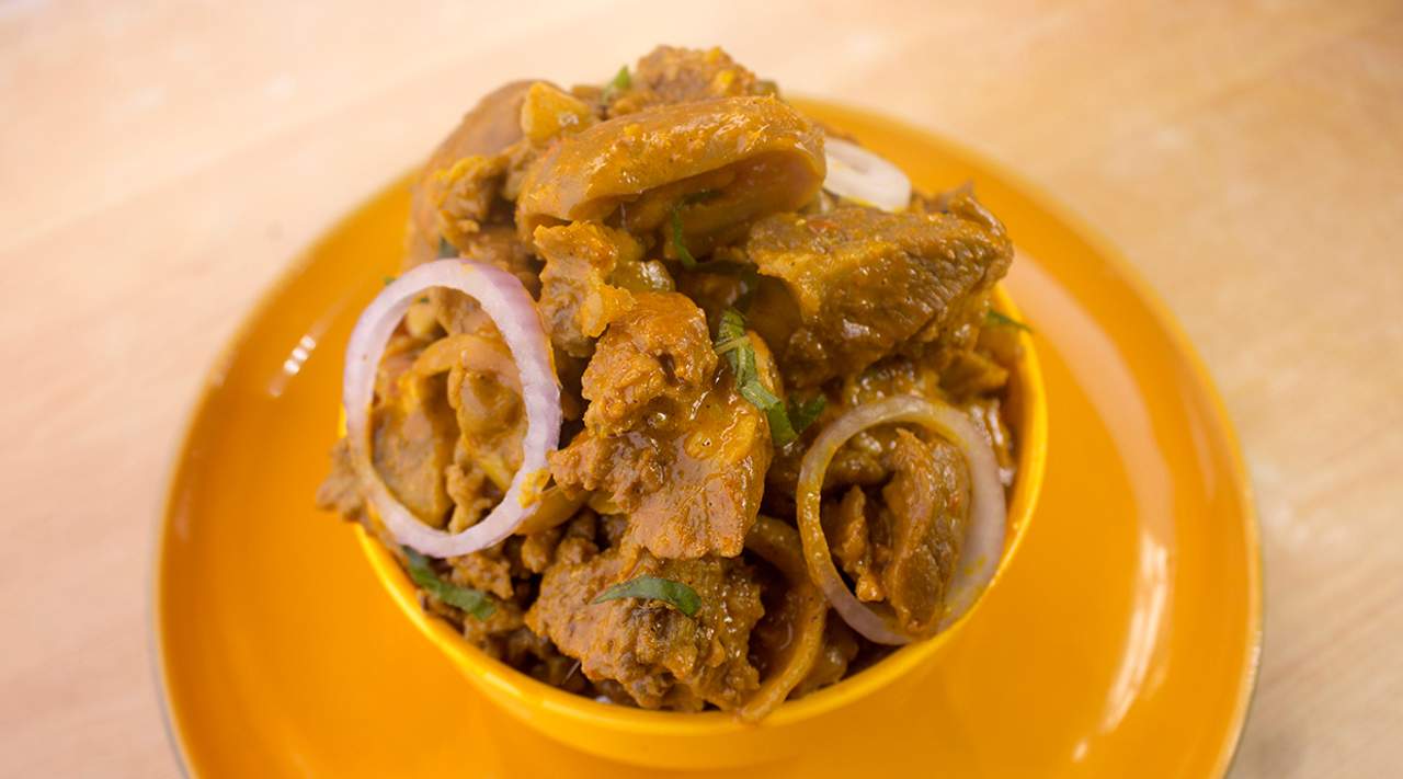 Nkwobi es un plato nigeriano hecho con pata de vaca, sazonado con especias como hojas de utazi, potasa y camarones secos, y servido en una salsa picante.