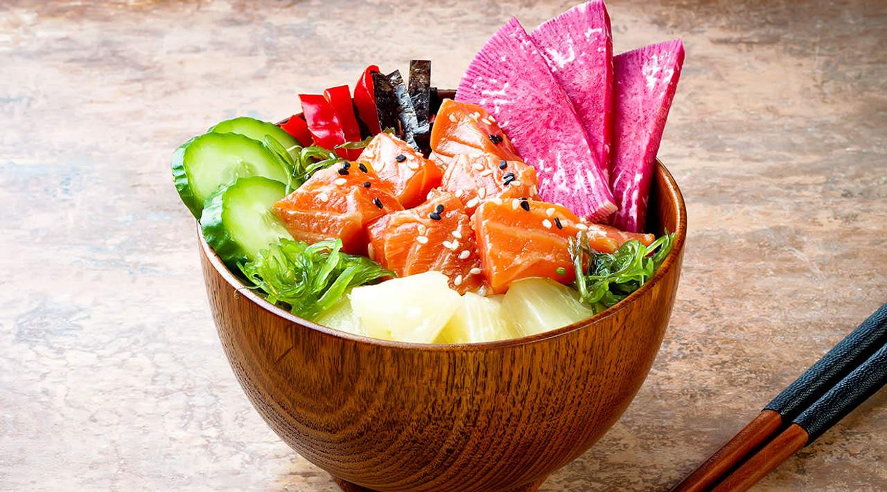 Arroz, salmón, edamame, cebollino, mango, pepino, alga wakame y salsa teriyaki