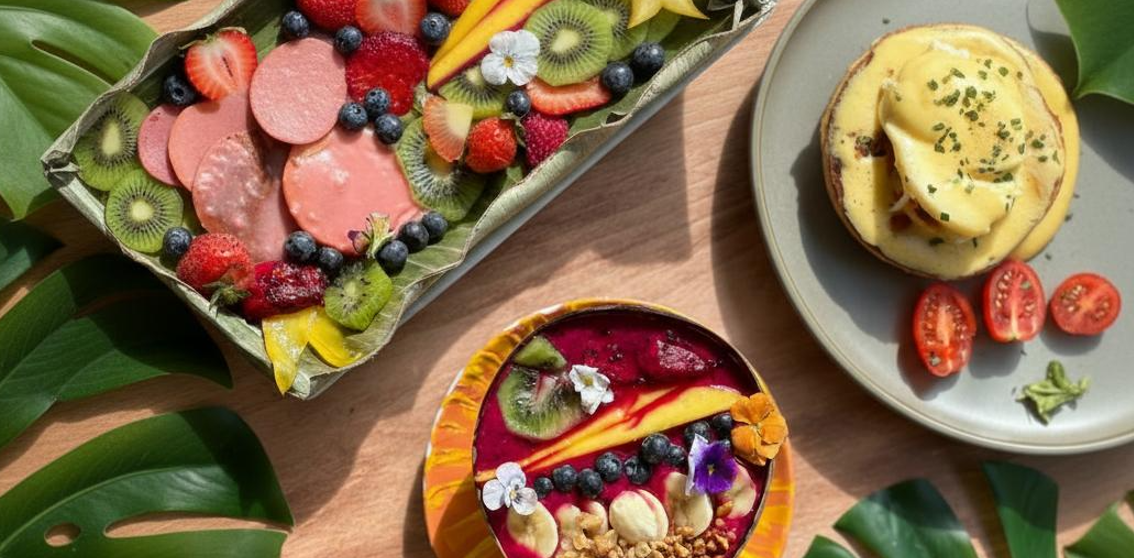 Puré de mango, leche de avena, granola, fruta y sirope de agave