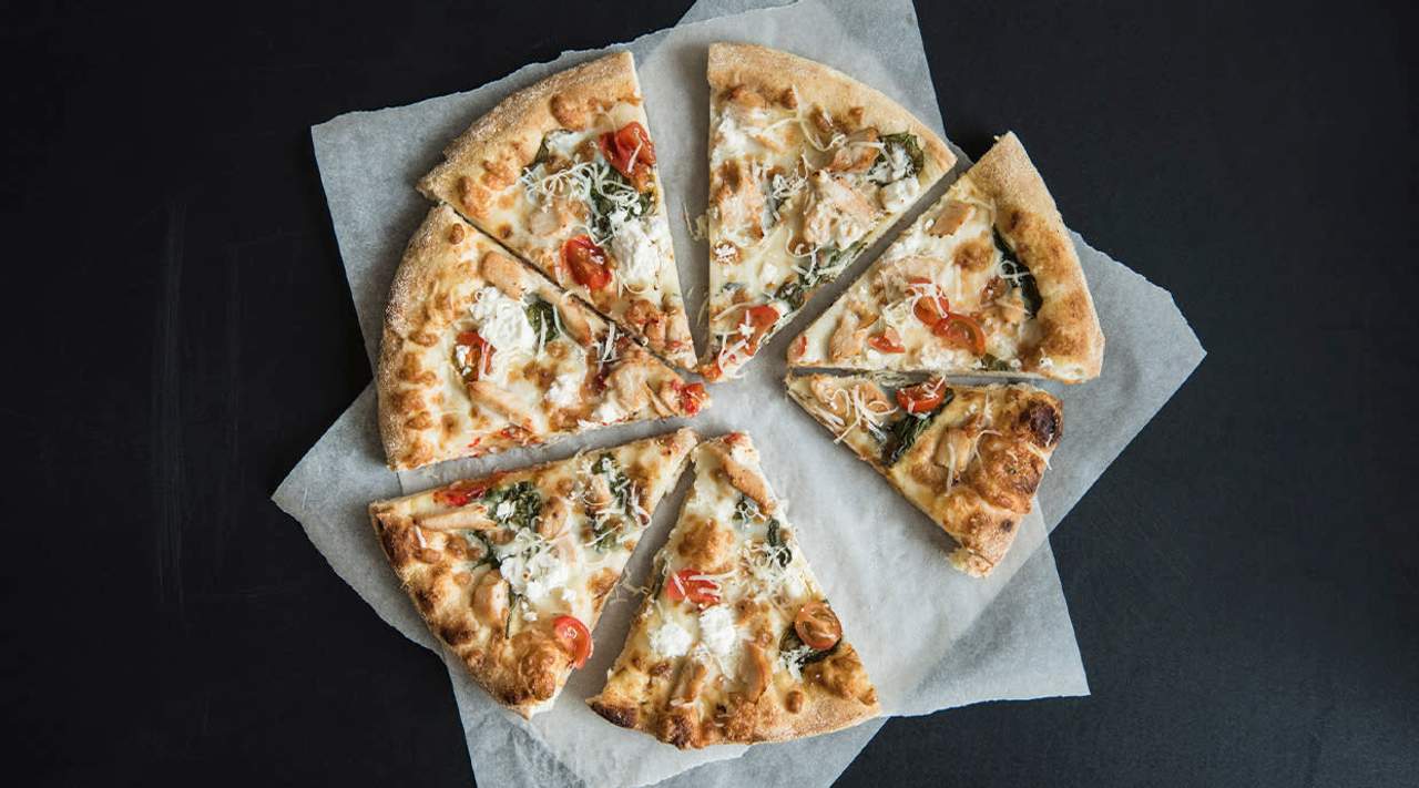 Salsa de tomate, mozzarella, champiñones frescos, aceitunas negras, pimientos horneados, cebolla roja, alcachofas, albahaca.