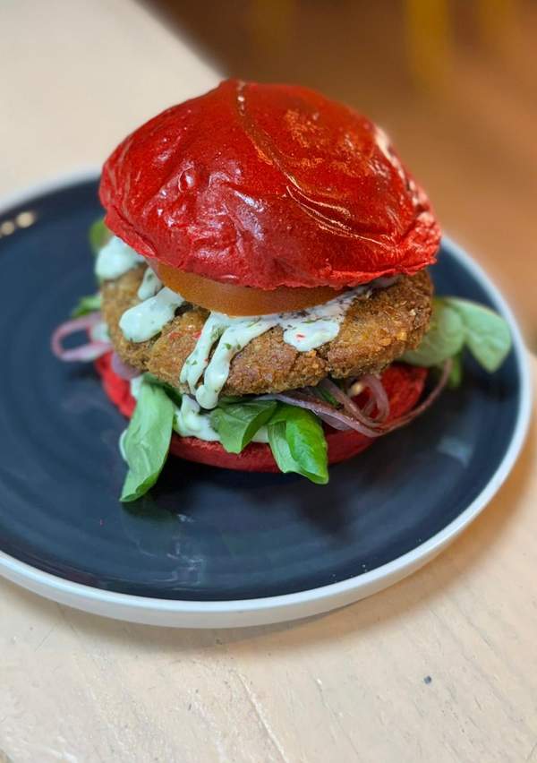 Pan de remolacha, tres falafel con brotes verdes, tomate, cebolla encurtida y mayonesal de cilantro