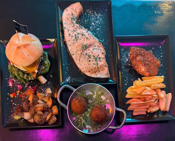 Langostinos a la plancha, chips de papas crocantes, salsa casera, mozzarella de bufala, berenjenas fritas y canónico