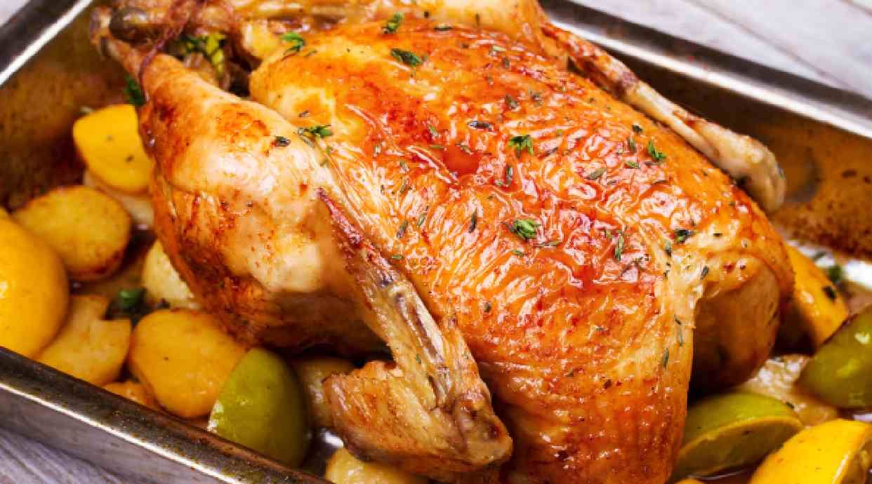 Muslito de pollo a'last rustido, con dos mitades de al caliu de guarnicion
