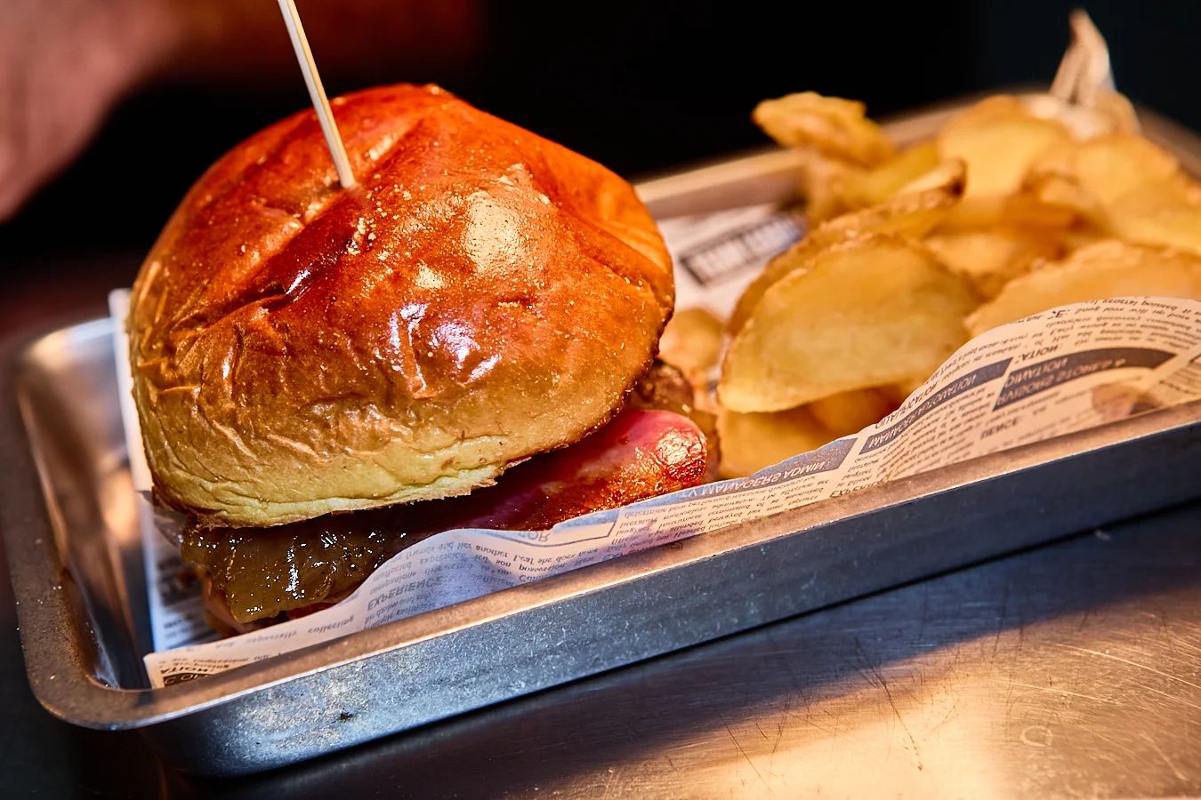 Burger Vadella 100gr, formatge cheddar, Bacó, Tomaquet, Enciam i Ceba caramellitzada. Amb patates freigides
