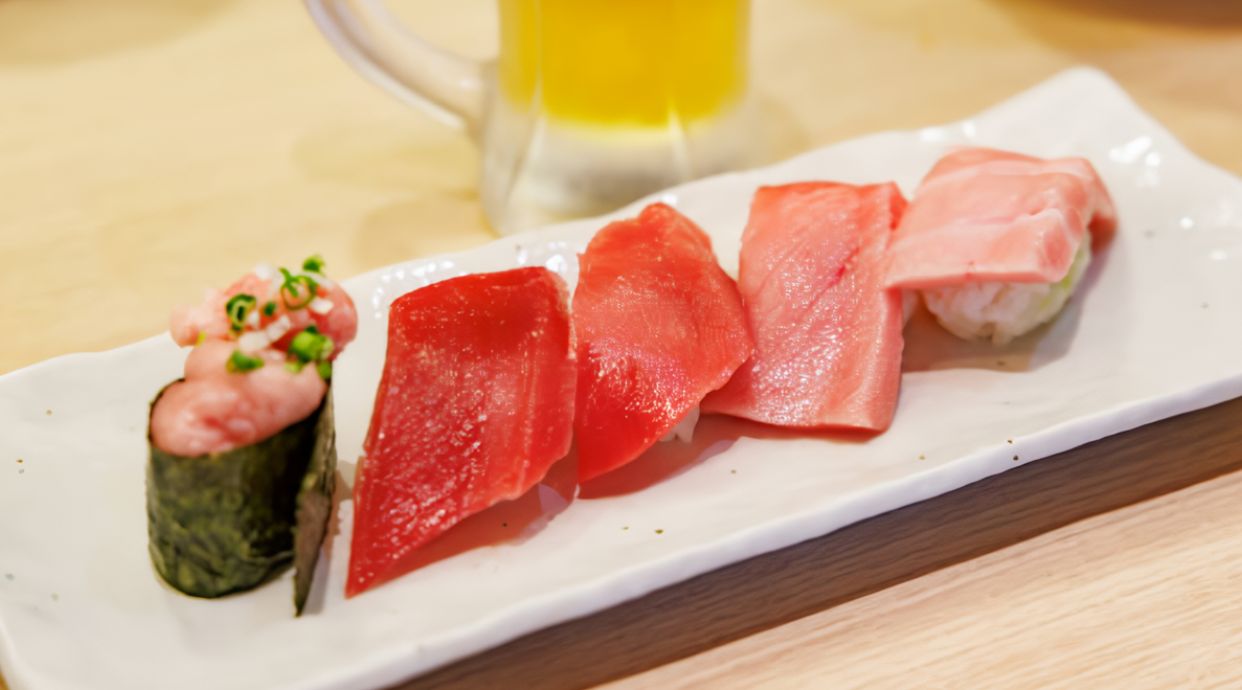 Bola de arroz cubierta con una loncha de atún ligeramente flambeada