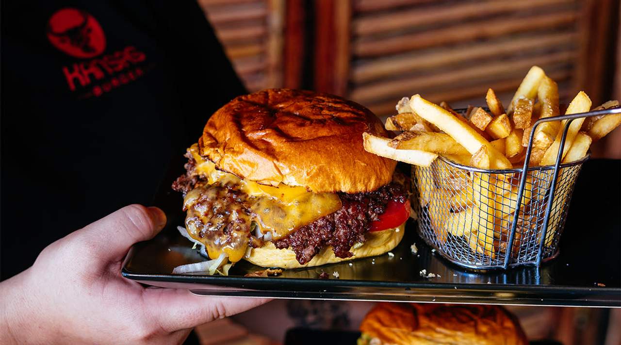 Salsa Kansas, 2 carnes smash, 3 quesos cheddar, cebolla a la plancha, 2 bacons, jalapeños, mostaza