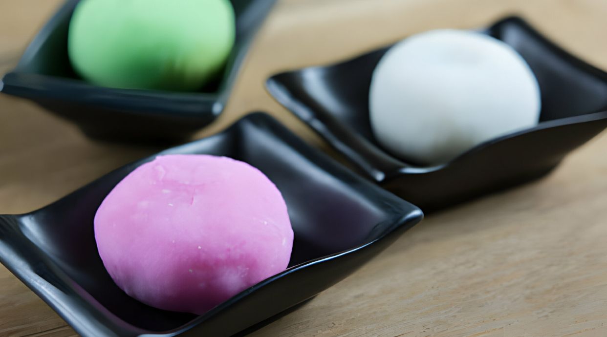 Envoltura de arroz glutinoso rellena de mousse de te matcha,un sabor tradicional japones.