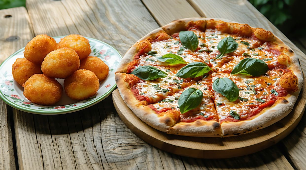 Relleno de ricotta dei Monti, salami Napoli, jamón cocido, fior di latte dei Monti, tomate triturado a mano, aceite de oliva virgen extra y albahaca